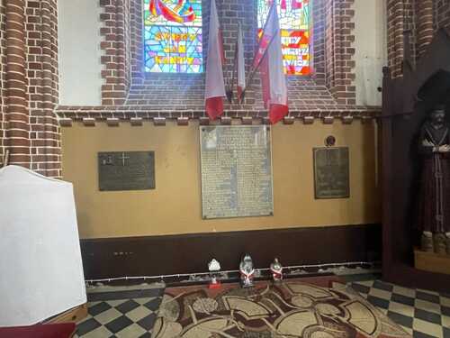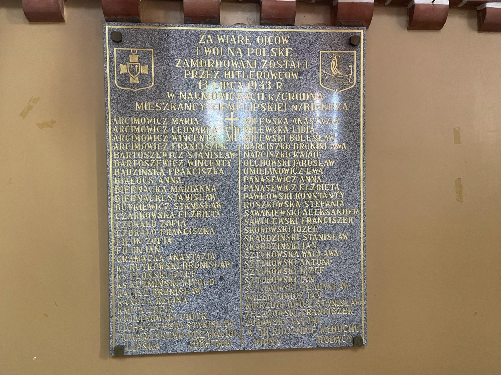 Okazały, neogotycki kościół pw. Matki Bożej Anielskiej jest gmachem wyróżniającym się w panoramie miasteczka i dobrze widocznym z wielu jego punktów. Stoi przy ul. Kościelnej, pod nr 28. Tablica zawieszona jest na wschodniej ścianie kościoła w nawie bocznej (na lewo od wejścia), w przestrzeni ograniczonej chórem, filarem podcienia chóru i pierwszym filarem rozdzielającym nawy. Obok wiszą tablice upamiętniające mieszkańców Lipska i jego okolic pomordowanych przez Niemców w Naumowiczach koło Grodna w lipcu 1943 r. oraz wywiezionych na Sybir podczas pierwszej okupacji sowieckiej w latach 1939–1941.