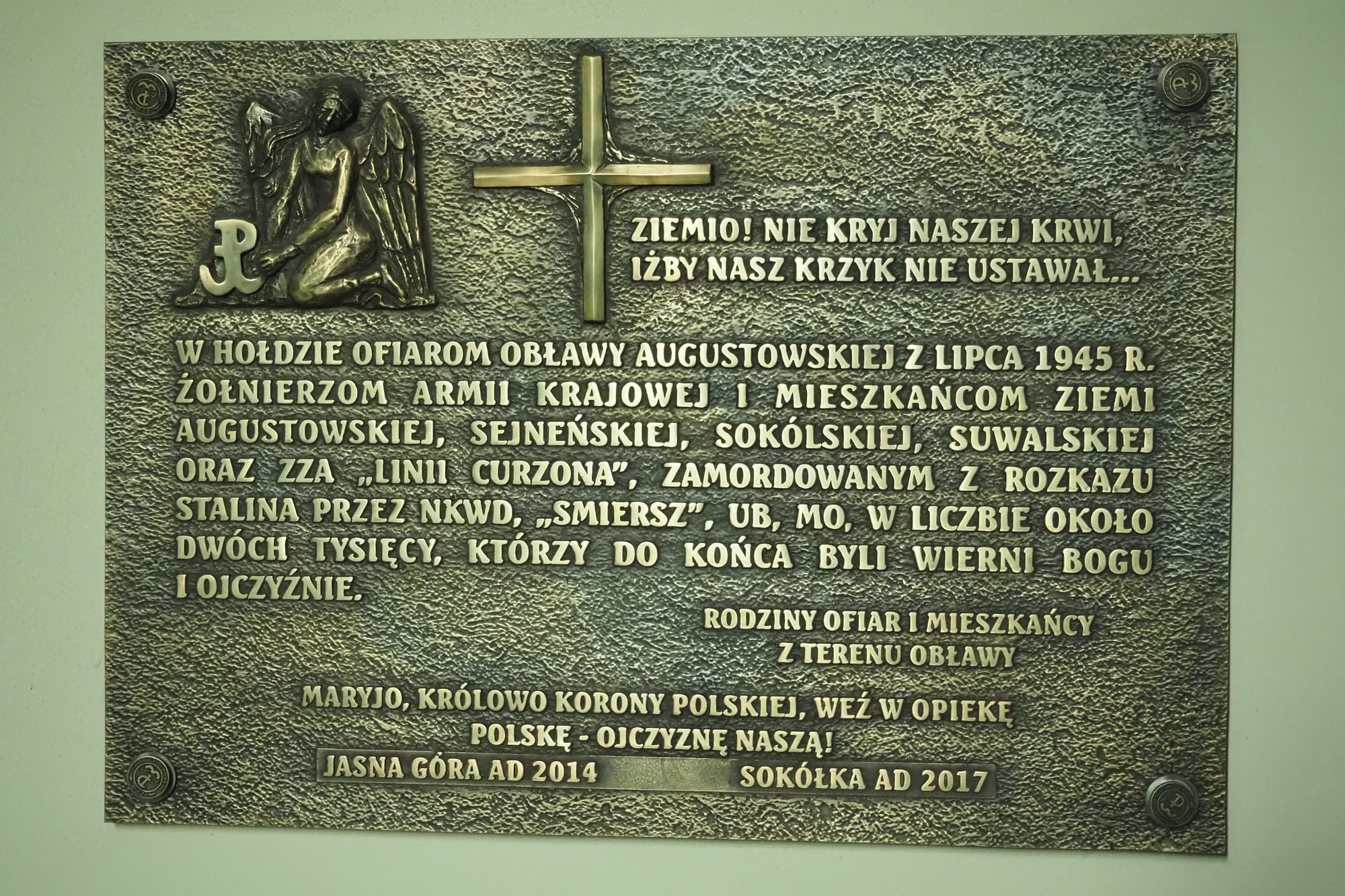 Przypomnijmy, że pierwowzór zawieszono w Częstochowie w 2014 r., a kopie, poza Sokółką, odsłonięto w Suwałkach w 2015 r., w Augustowie w 2016 r. oraz w Lipsku w 2019 r. Historię tablicy częstochowskiej przywołano już przy okazji opisu jej kopii umieszczonej na murach Bazyliki Mniejszej Najświętszego Serca Jezusowego w Augustowie (punkt 4. na liście). Tablica dedykowana ofiarom Obławy Augustowskiej zwisła wśród innych upamiętnień, poświęconych m.in. bł. ks. Jerzemu Popiełuszce czy mieszkańcom ziemi sokólskiej – ofiarom II wojny światowej.